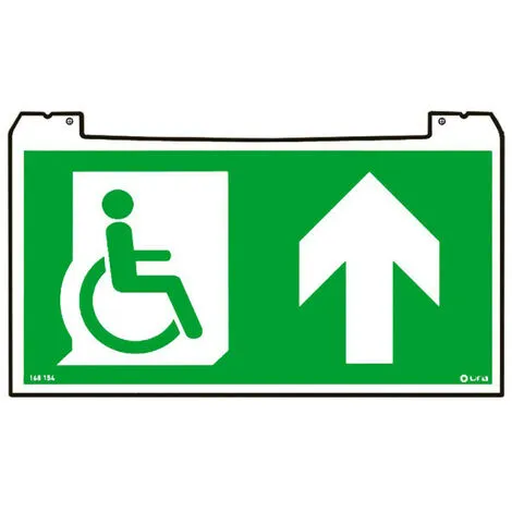 Ura – Porte-pictogramme standard sérigraphié signalisation d’évacuation Practice Évolution avec sortie Personnes à Mobilité Réduite PMR et flèche vers le haut – 188x107mm – utilisable en simple ou double face